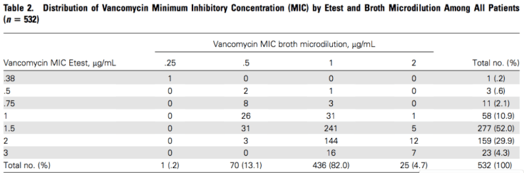 Este estudio demuestra por primera vez que debe haber otros factores distintos a la eficacia de la vancomicina implicada en un peor pronóstico de estos pacientes con infecciones por S. aureus con CIM a vancomicina >1.5 mcg/mL. Esto implica que es posible que la utilización de un agente alternativo a la vancomicina no mejore el pronóstico de estos pacientes.