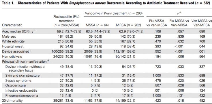 Se trata de un estudio observacional prospectivo multicéntrico en el que participaron 27 centros de Australia y Nueva Zelanda en los que se han recogido más de 7.000 bacteriemias por S. aureus. Sobre el total de bacteriemias se seleccionaron todos los casos de bactermia por SASM y SARM que entre enero de 2007 y noviembre de 2008 recibieron tratamiento con vancomicina. Cada paciente fue pareado con el siguiente paciente por orden de registro que había sido tratado con flucoxacilina. De todos estos pacientes se evaluaron: a) datos demográficos básicos (edad, sexo) b) el origen de la infección c) presencia de catéteres u otro material protésico d) presentación clínica e) sensibilidad o resistencia a meticilina f) tratamiento recibido y g) mortalidad a los 30 días. Desde el punto de vista metodológico la CMI a vancomicina se midió por E-Test y por dilución en caldo.
