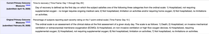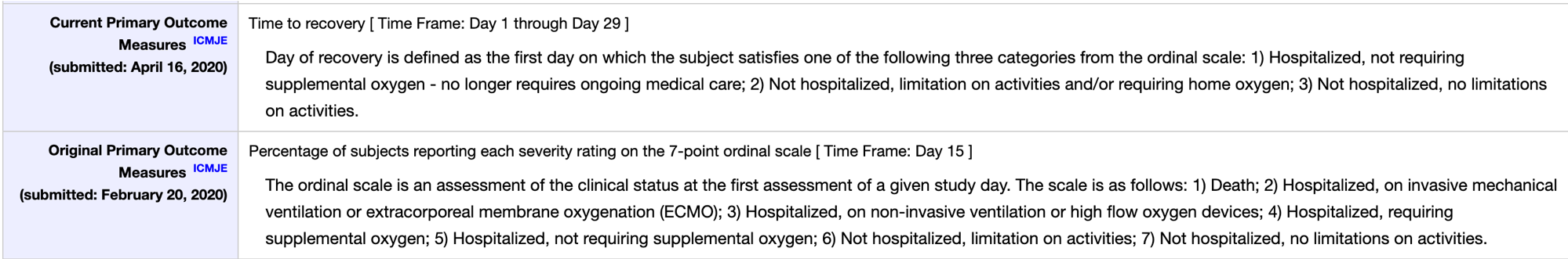 Current (Feb 20) and original (April 15) ACTT primary outcome. Source: ClinicalTrials.gov