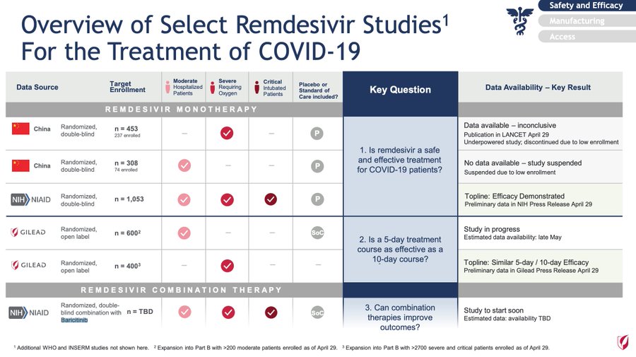 Overview of Select Remdesivir Studies (Source: Gilead ) See: http://investors.gilead.com/static-files/af4599eb-4fb8-4cf7-96a1-38caf477e9b4.