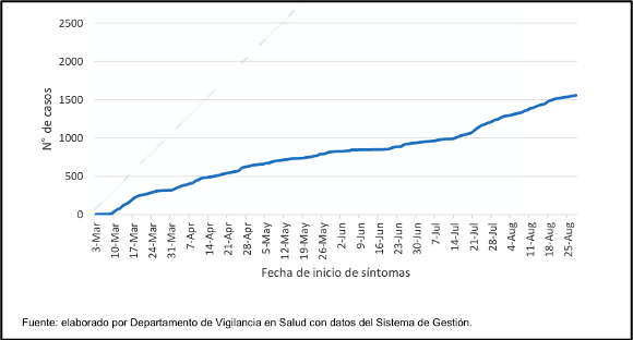 según fecha de inicio de síntomas. Uruguay, 2020 (al 28/08/2020)