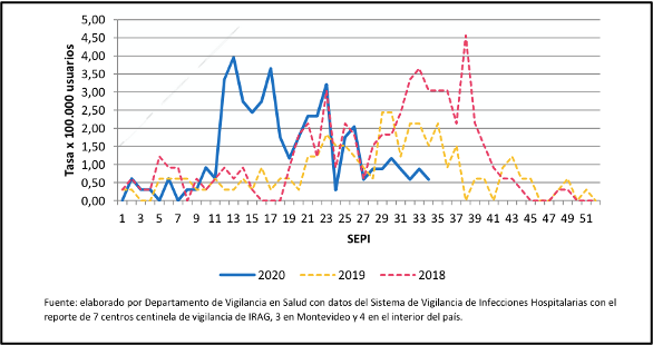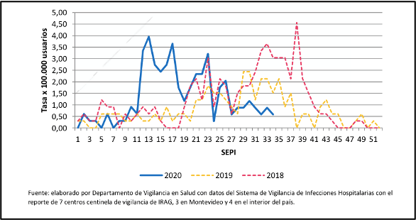 en centros centinela por semana epidemiológica. Uruguay, 2018-2020.