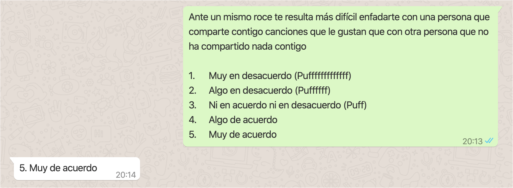 Pregunta casual (Likert-style) sobre la utilidad de compartir música para fomentar un ambiente de trabajo positivo