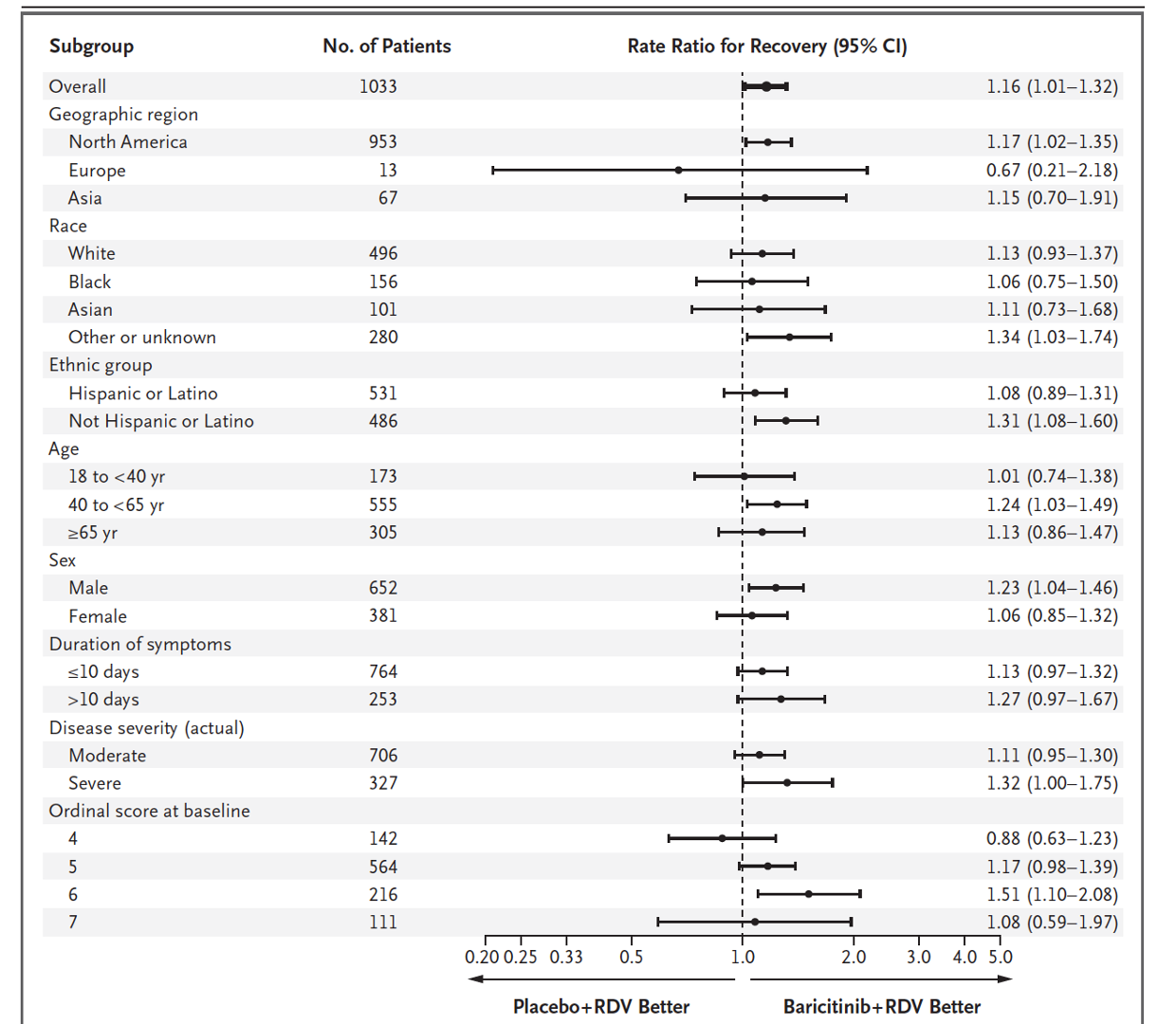 - No está demostrado pero no descartaría un beneficio de mortalidad en poblaciones con más alta mortalidad. Las poblaciones del ACTT-2 y la del RECOVERY son muy distintas (la mortalidad de ACTT-2 es mucho más baja en todos los subgrupos) por lo que resulta difícil comparar los beneficios demostrados con dexametasona (de mortalidad y especialmente en pacientes más graves) con los de baricitinib. El ACTT-4 ya compara dexametasona con baricitnib, pero de nuevo con remdesivir en ambos brazos.