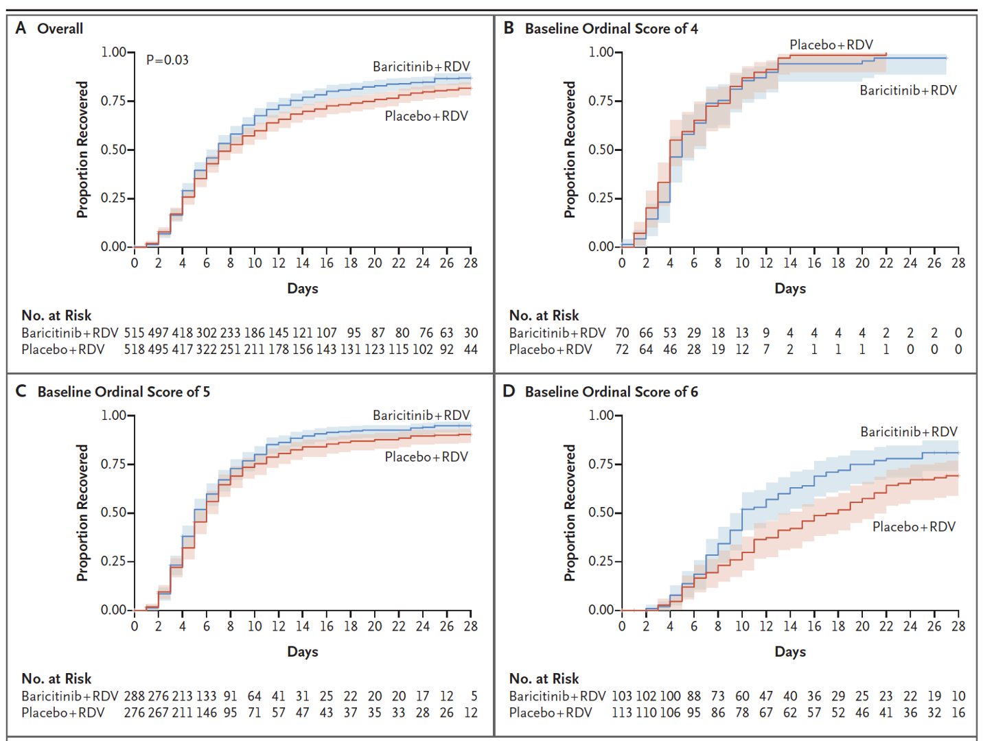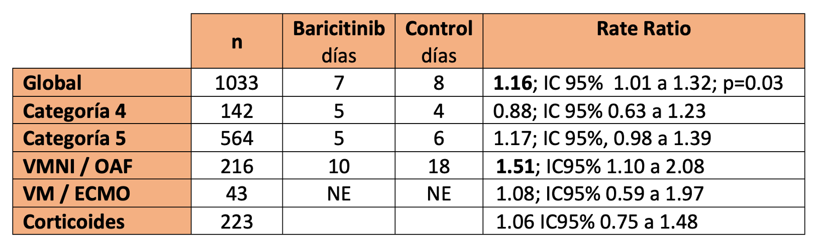 - La disminución global del tiempo hasta la recuperación global es de 1 día siendo máxima (8 días) en aquellos pacientes que precisan VMNI o OAF. Este subgrupo de pacientes (VMNI / OAF) probablemente sea el que más se beneficie de baricitinib.