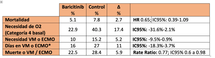 - La incidencia de eventos adversos grado 3-4 fue similar en ambos grupos: 40,6% baricitinib y 46,8% en el grupo de control.