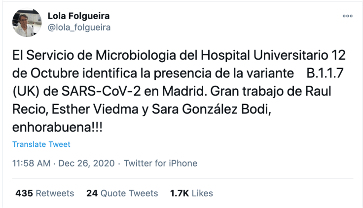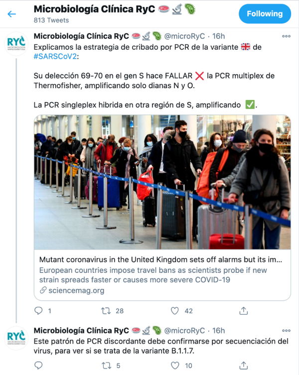 - Los compañeros del Servicio de Microbiología del Hospital Ramón y Cajal comparten una forma (ver aquí) de tratar de identificar si estamos ante una variante 201212/01 analizando los resultados de la PCR «convencional» (no es posible con todas las técnicas en uso)