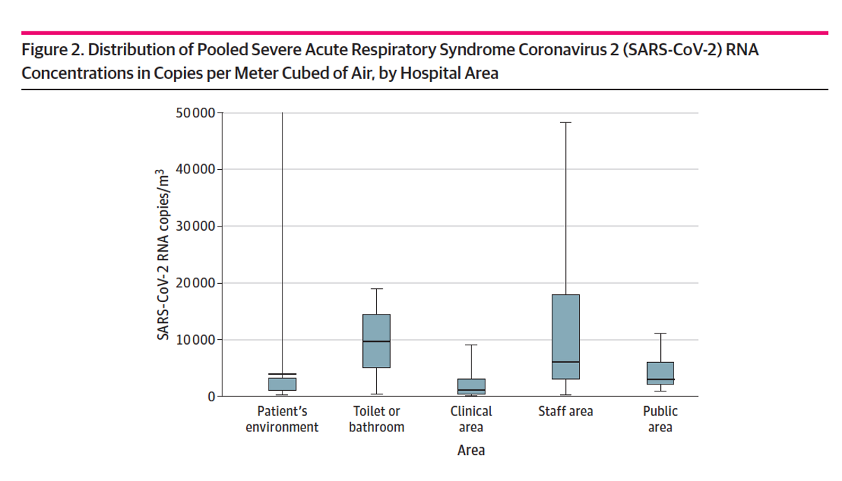 - Assessment of Air Contamination by SARS-CoV-2 in Hospital Settings (JAMA Network Open). En este estudio se revisan 24 estudios en los que ha analizado la presencia de ARN y/o cultivado SARS-CoV-2 en muestras (471) de aire de diferentes entornos. La proporción de muestras que contenían ARN de SARS-CoV-2 fue del 17%, identificándose virus viable en solo el 9% de las muestras analizadas. La probabilidad de recuperar ARN fue mayor en UCI que en áreas de hospitalización convencional. La cantidad de copias de SARS-CoV-2 en baños, áreas reservadas para el personal y pasillos y otras áreas públicas no fue más baja que en el entorno del paciente. Sin embargo, los cultivos positivos se recuperaron más frecuentemente en muestras de aire obtenidas cerca del paciente.