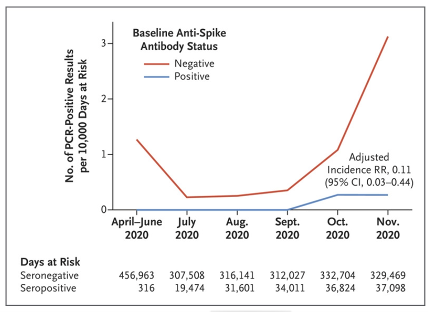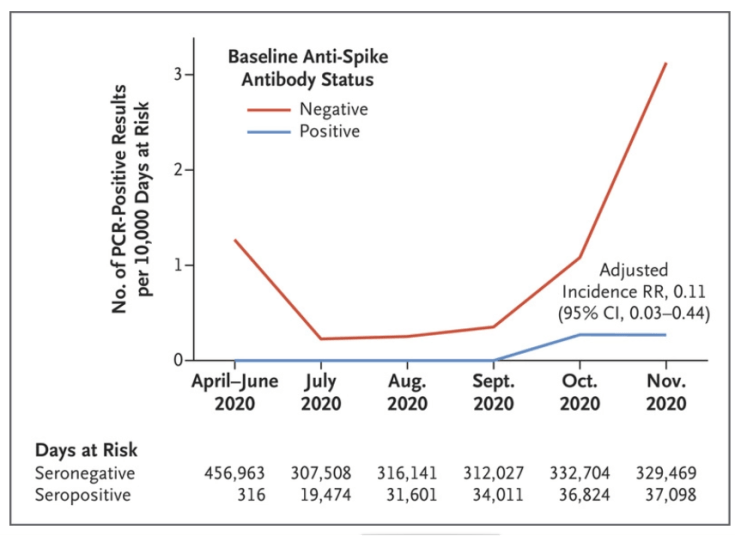 - Antibody Status and Incidence of SARS-CoV-2 Infection in Health Care Workers (NEJM). Trabajo muy interesante por la información que aporta con un diseño extremadamente sencillo. Se trata de un estudio observacional prospectivo realizado en trabajadores sanitarios de la red de hospitales de la Universidad de Oxford. Se comparó la frecuencia de infección confirmada por SARS-CoV-2 entre profesionales que tenían y profesionales que no tenían IgG frente a SARS-CoV-2 al principio del seguimiento. Se incluyeron 12.541 personas, de las cuales 1.265 tenían anticuerpos al principio del seguimiento (10,1%). En sólo 2 de estos 1.265 profesionales con anticuerpos positivos en el momento se identificó una nueva PCR positiva para SARS-CoV-2, siendo ambos casos asintomáticos, frente a 223/11.276 profesionales sin anticuerpos basales. El riesgo de un episodio de infección por SARS-CoV-2 fue de 0,13 /10.000 días de riesgo en los individuos con IgG anti SARS-CoV-2 basal vs 1,09 /10.000 días de riesgo en aquellos sin anticuerpos basales, lo que hace que el riesgo de una infección sea 9 veces menor en individuos con evidencia de infección previa al menos durante los primeros 6 meses (razón de riesgo ajustada 0,11; IC95 0,03-0,44; p=0,002).