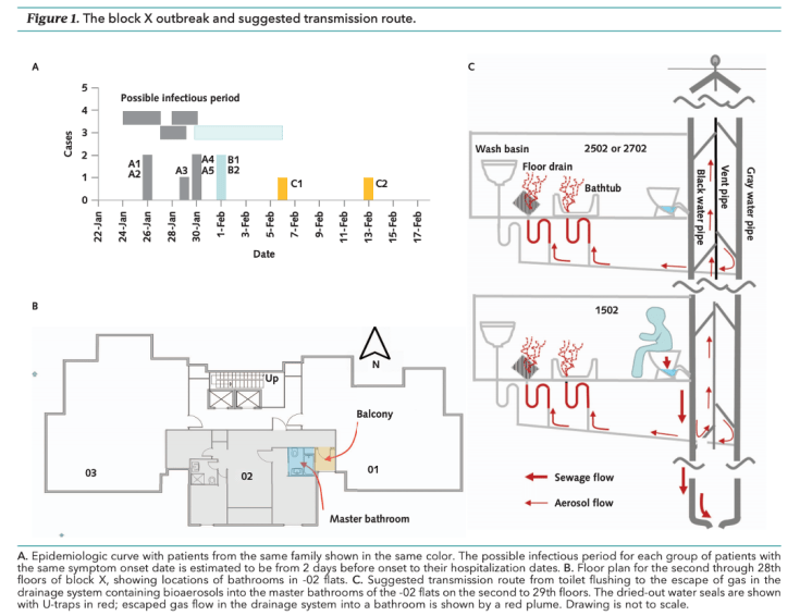 - Probable Evidence of Fecal Aerosol Transmission of SARS-CoV-2 in a High-Rise Building (Annals of Internal Medicine). Este es un curioso estudio chino que trata de analizar si los casos observados en 3 unidades familiares en tres pisos consecutivos de un edificio de apartamentos chino podría estar relacionado con la transmisión aérea de aerosoles fecales. Tras un detallado estudio de bioingeniería, parece la hipótesis más segura. Independientemente de lo acertado de este planteamiento, se trataría de una forma minoritaria de transmisión.