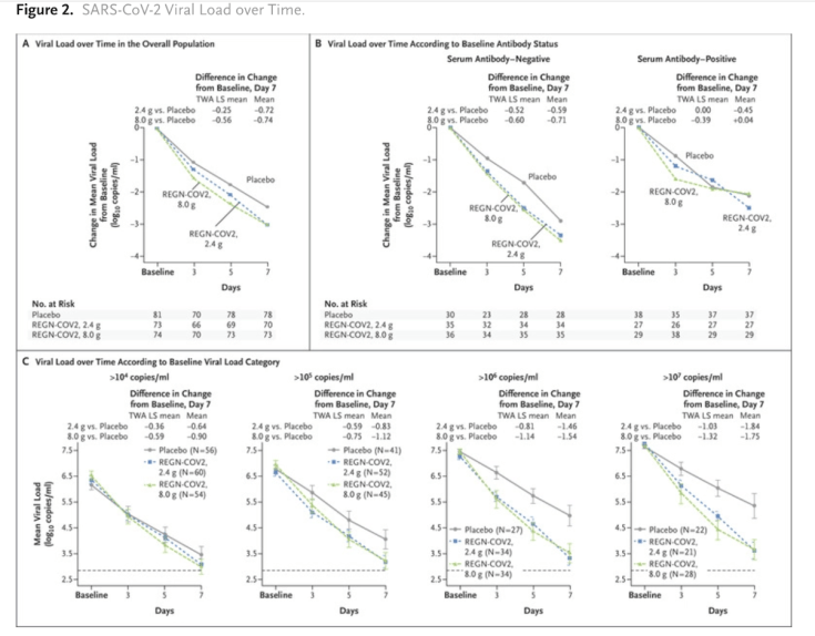 - REGN-COV2, a Neutralizing Antibody Cocktail, in Outpatients with Covid-19 (NEJM). En este ensayo clínico aleatorizado doble ciego de fase 1-3 con un cocktail de anticuerpos neutralizantes frente a SARS-CoV-2 (REGN-COV2) en pacientes con Covid-19 que no precisaban hospitalización se observó, en un análisis preliminar, un descenso significativo de la carga viral entre aquellos que recibieron la combinación de anticuerpos. Este descenso fue más significativo entre aquellos pacientes que no tenían anticuerpos frente a SARS-CoV-2 en el momento de la aleatorización y entre aquellos con una carga viral más elevada.