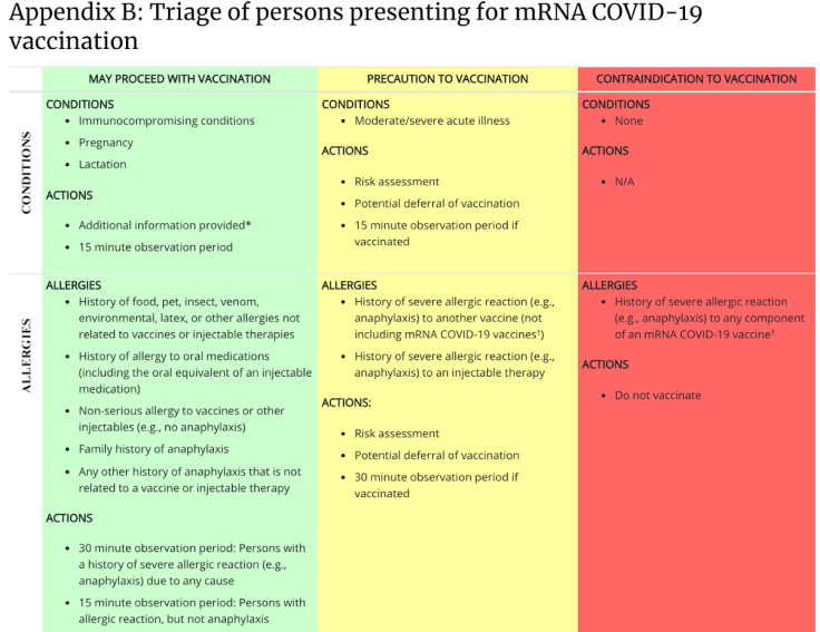 - Interim Clinical Considerations for Use of mRNA COVID-19 Vaccines Currently Authorized in the United States (CDC). Documento de los CDC estadounidense sobre aspectos clínicos relacionados con la utilización de las vacunas de ARN-m. Incluye la siguiente tabla sobre circunstancias concomitantes, incluidas alergias, que podrían condicionar la vacunación.