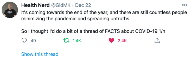 - 20 Facts About COVID-19 (Gideon M-K; HealthNerd). Health Nerd, una fuente muy autorizada, resume lo que (creemos) que realmente sabemos de SARS-CoV-2 y Covid-19. @GidMK lo resume en uno de los mejores hilos de twitter de la temporada