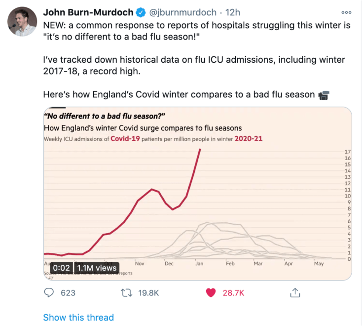 - La comparación de la magnitud de la tercera ola británica con otras temporadas invernales (en la imagen el número ingresos en UCI) es muy elocuente, en este hilo de @jburnmurdoch con interesantes gráficos animados.