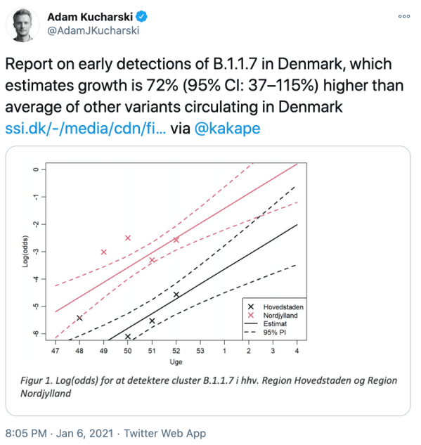 - La variante B.1.1.7 se expande rápidamente también en Dinamarca como indica el epidemiólogo-matemático @AdamJKucharski en este hilo. Que el fenómeno se observe en otros países distintos al RU sugiere que esta variante tiene una ventaja competitiva (p. ej. transmisibilidad) respecto a las demás, lo que, lógicamente es preocupante. Según Kucharski, la situación de Dinamarca es como la del RU en noviembre, por lo que si la cepa es realmente más transmisible, aumenta la necesidad de acelerar la estrategia vacunal.