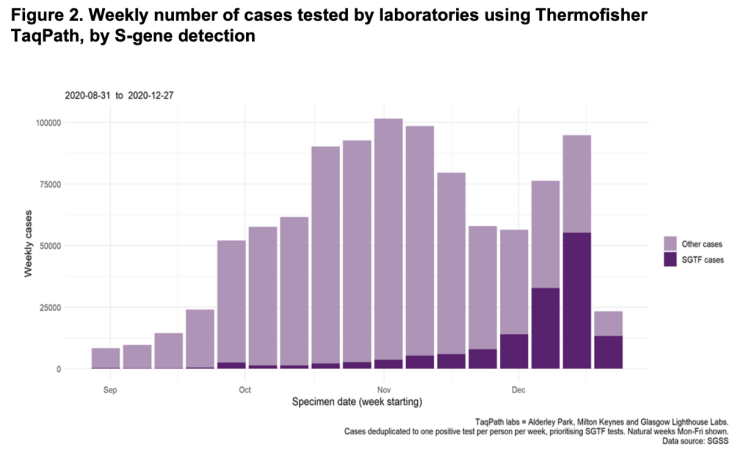 - Investigation of novel SARS-CoV-2 variant Variant of Concern 202012/01 Technical briefing 2 (Public Health England). El último informe de situación de PHE detalla la expansión de la nueva variante en las últimas semanas (en la figura de arriba se puede ver cómo las barras más oscuras -variante B.1.1.7- suponen cada vez más una mayor proporción del total de infecciones). Entre los datos que aportan está la tasa de ataque de esta variante, que es más alto que el del resto de variantes analizadas de forma global (15.1% vs 9.8%).