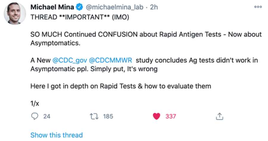 - En este hilo, @michaelmina_lab, epidemiólogo en Harvard y uno de los máximos defensores de que el acceso generalizado de la población a pruebas diagnósticas rápidas es una de las estrategias básicas para el control de la pandemia defiende la utilidad de las pruebas de antígeno rápido para el cribado de pacientes asintomáticos, a pesar de la baja sensibilidad analítica porque el objetivo no es identificar pacientes asintomáticos que hayan estado infectados sino pacientes contagiosos.
