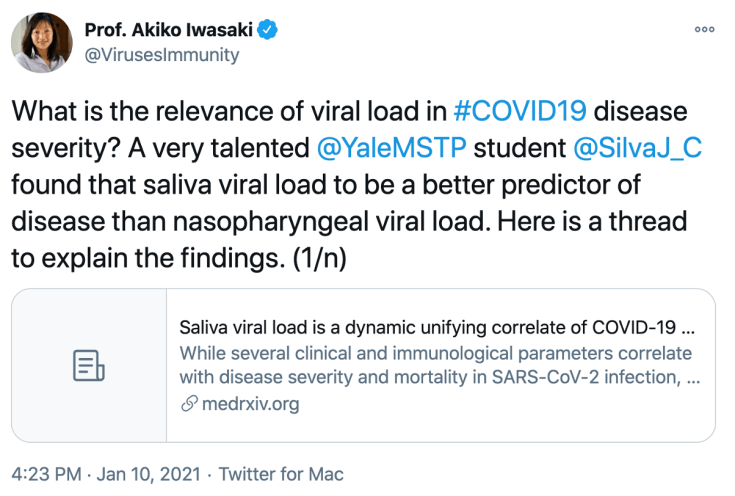 - Saliva viral load is a dynamic unifying correlate of COVID-19 severity and mortality (medRxiv). Resumido en este hilo de @VirusesImunity