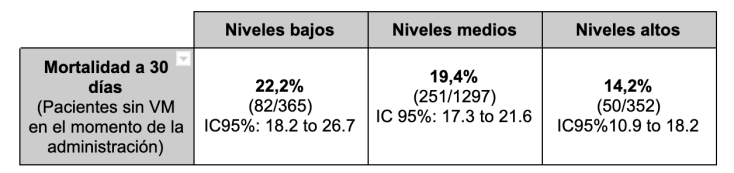 - Aspectos interesantes de este estudio: a) La asignación del plasma se realizó desconociendo los niveles de anticuerpos en las unidades de plasma trasfundidas, en una suerte de aleatorización / enmascaramiento. b) Muestra una relación dosis / respuesta (niveles de anticuerpos / mortalidad), uno de los postulados de causalidad de Bradford-Hill. c) Es coherente con otros trabajos en los que se sugiere que la administración en fases precoces (antes de la necesidad de IOT / VM) tiene un mayor impacto. Nota: Los IgG frente a proteína S de SARS-CoV-2 se determinaron mediante quimioluminiscencia (ensayo cualitativo). No se realizó ensayo de neutralización (medida de anticuerpos neutralizantes) pero se ha demostrado correlación entre IgG anti proteína S y neutralización. La cuantificación se realizó mediante el índice de positividad, considerándose niveles altos el P80, niveles medios P20-P80 y niveles bajos P20. Los alto se correspondieron con títulos > 1:2560 en un ensayo cuantitativo.