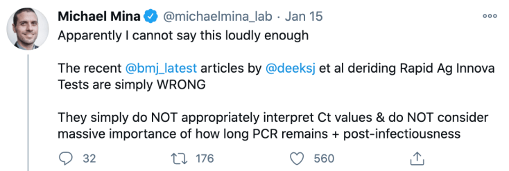 - El hilo de @michaelmina_lab que tenéis arriba no tiene desperdicio. Mina insiste en el valor de los test antigénicos para el control de la pandemia (a pesar de su sensibilidad analítica menor) y reta en duelo a @deeksj, un firme opositor, quien aparentemente no recoge el guante.