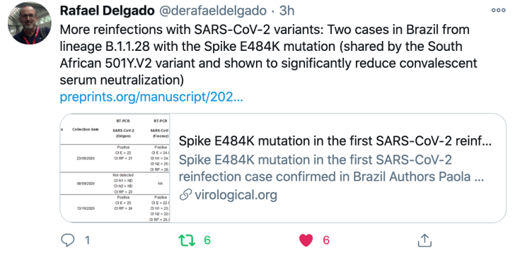 - Spike E484K mutation in the first SARS-CoV-2 reinfection case confirmed in Brazil, 2020 (virological.org). Este artículo que documenta una reinfección con la variante brasileña que hemos encontrado a través de @derafaeldelgado sugiere que la mutación E484K de esta variante puede ser una vía de escape inmune para SARS-CoV-2.