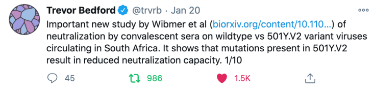 - SARS-CoV-2 501Y.V2 escapes neutralization by South African COVID-19 donor plasma (BioXriv). Anticuerpos monoclonales y plasma convaleciente de 44 individuos mostraron una menor capacidad neutralizante frente a SARS-CoV-2 de la variante 501Y.V2 que frente al SARS-CoV-2 original. La mediana de reducción de título fue de 8 veces. Y en 21/44 no se objetivó capacidad neutralizante significativa. @trvbr lo explica muy claramente en este hilo.