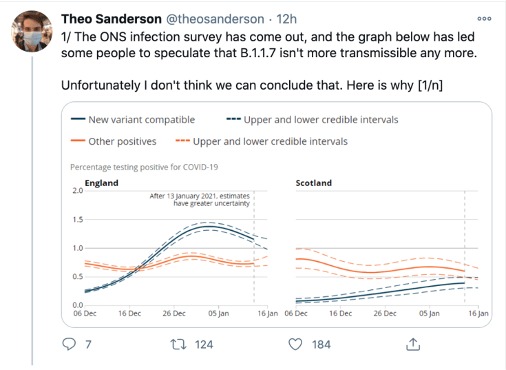 - Algunos datos sugieren que la expansión de la cepa britanica se está frenando en el Reino Unido. En este hilo (ver arriba), @theosanderson explica por qué estas aparentemente buenas noticias pueden ser el resultado de un artefacto microbiológico.