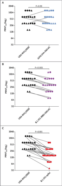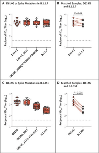 - Neutralizing Activity of BNT162b2-Elicited Serum — Preliminary Report (NEJM) In vitro, los anticuerpos generados por la vacuna de Pfizer/BioNtech neutralizan la variante sudafricana B.1.351 dos tercios menos que contra la variante previa estudiada.