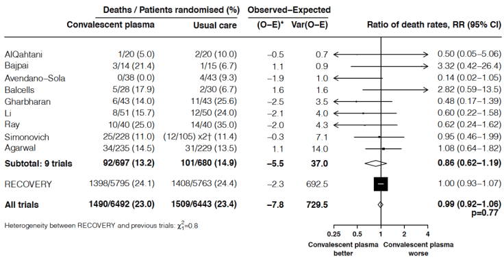 El ensayo RECOVERY ha sido una de las principales fuentes de conocimiento durante esta pandemia y sus publicaciones no revisadas por terceros (preprints) hasta la fecha han tenido una alta calidad. Incluye además un análisis conjunto (metanálisis) de todos los ensayos de plasma. Por eso, a continuación resumimos el artículo mediante un rápido análisis PICO: