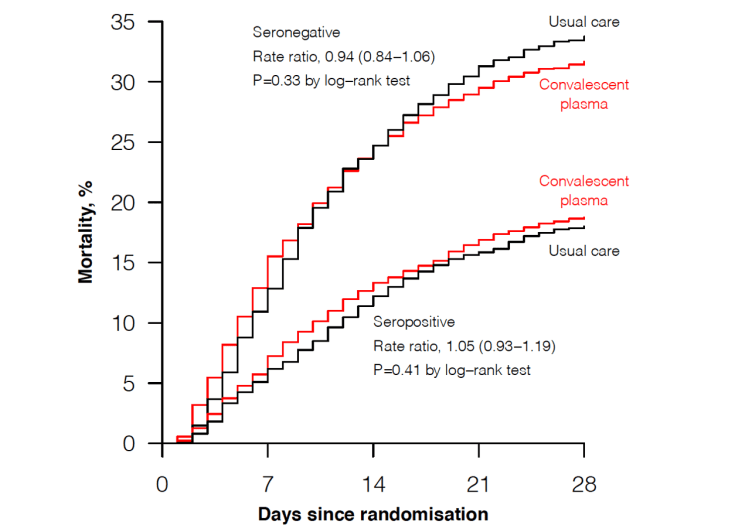 - La mortalidad a 28 días fue del 24% en ambos brazos (RR 1; IC95% 0,97 a 1,03). La mortalidad fue más alta entre pacientes seronegativos en el momento de la aleatorización que entre pacientes seropositivos, pero no se observaron diferencias entre los pacientes que recibieron plasma o no lo recibieron (32% -plasma- vs 34%; RR 0,94; IC95% 0,84 a 1,06).