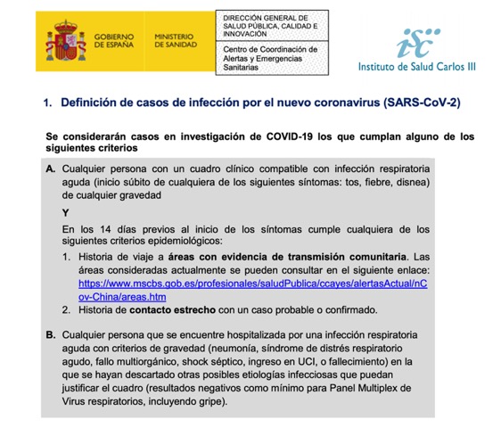 - Información del Ministerio de Sanidad de España. Incluye el procedimiento de actuación frente a casos de infección, del que a continuación extraemos la definición de caso.