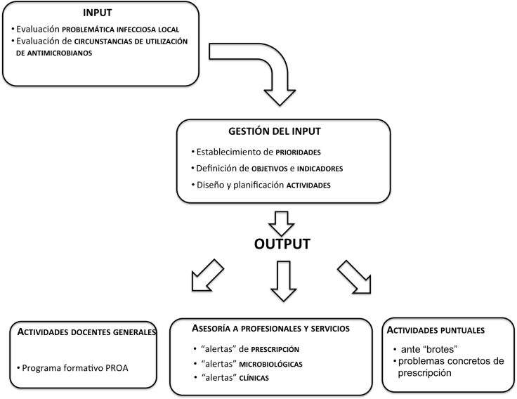 La observación de la problemática infecciosa local y de las circunstancias de utilización de antimicrobianos (Input) debe ser elaborada para establecer áreas prioritarias de actuación sobre las que diseñar intervenciones cuyo impacto debe ser evaluado de acuerdo a criterios definidos a priori (Gestión del input). Las actividades realizadas en el seno de un PROA (Output) pueden ser bien puramente docentes, o realizarse en forma de asesoría basada en problemas clínicos, de prescripción o microbiológicos. En situaciones epidemiológicas especiales (e.g. brotes) un PROA debe plantear medidas puntuales, a veces restrictivas.